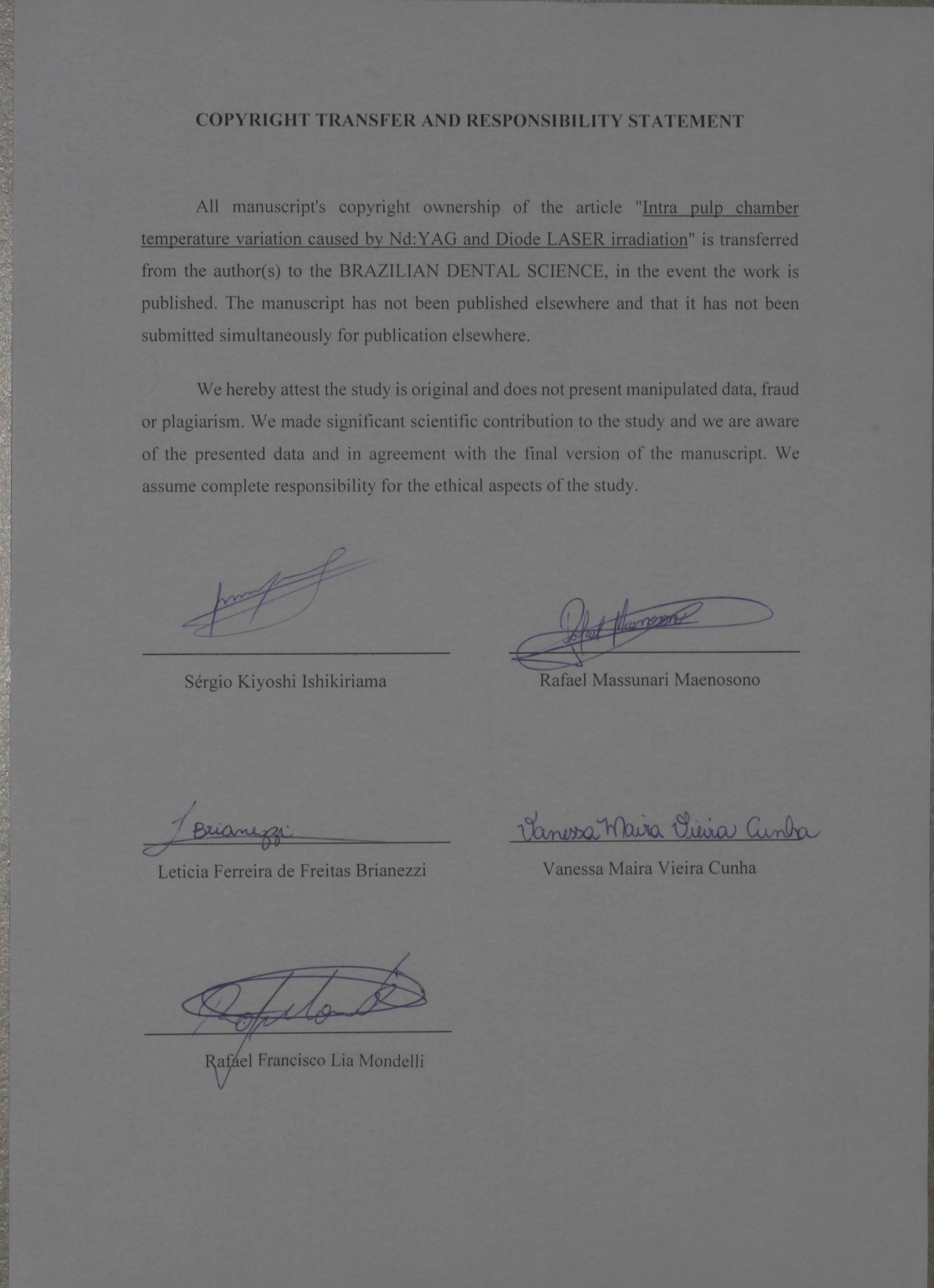 Brazilian Dental Science uses the Creative Commons (CC-BY 4.0) license, thus preserving the integrity of articles in an open access environment. The journal allows the author to retain publishing rights without restrictions.