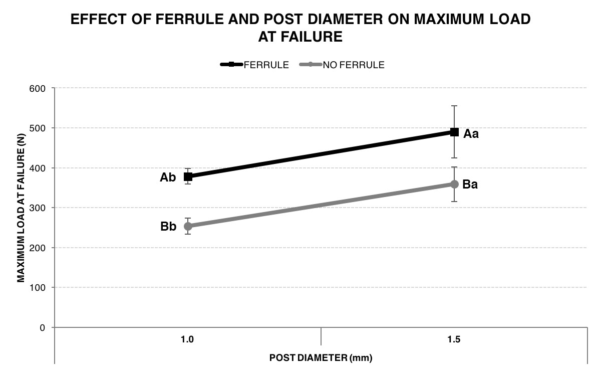 Results: Both post diameter and ferrule statistically affected the maximum load at fracture (P=0.004 and P=0.013, respectively). The highest mean values were observed for samples with ferrule and wider post size (490N), while the lowest were observed for samples without ferrule and narrower post size (254N). There was no relationship between the presence of a ferrule and post size (P=0.937).