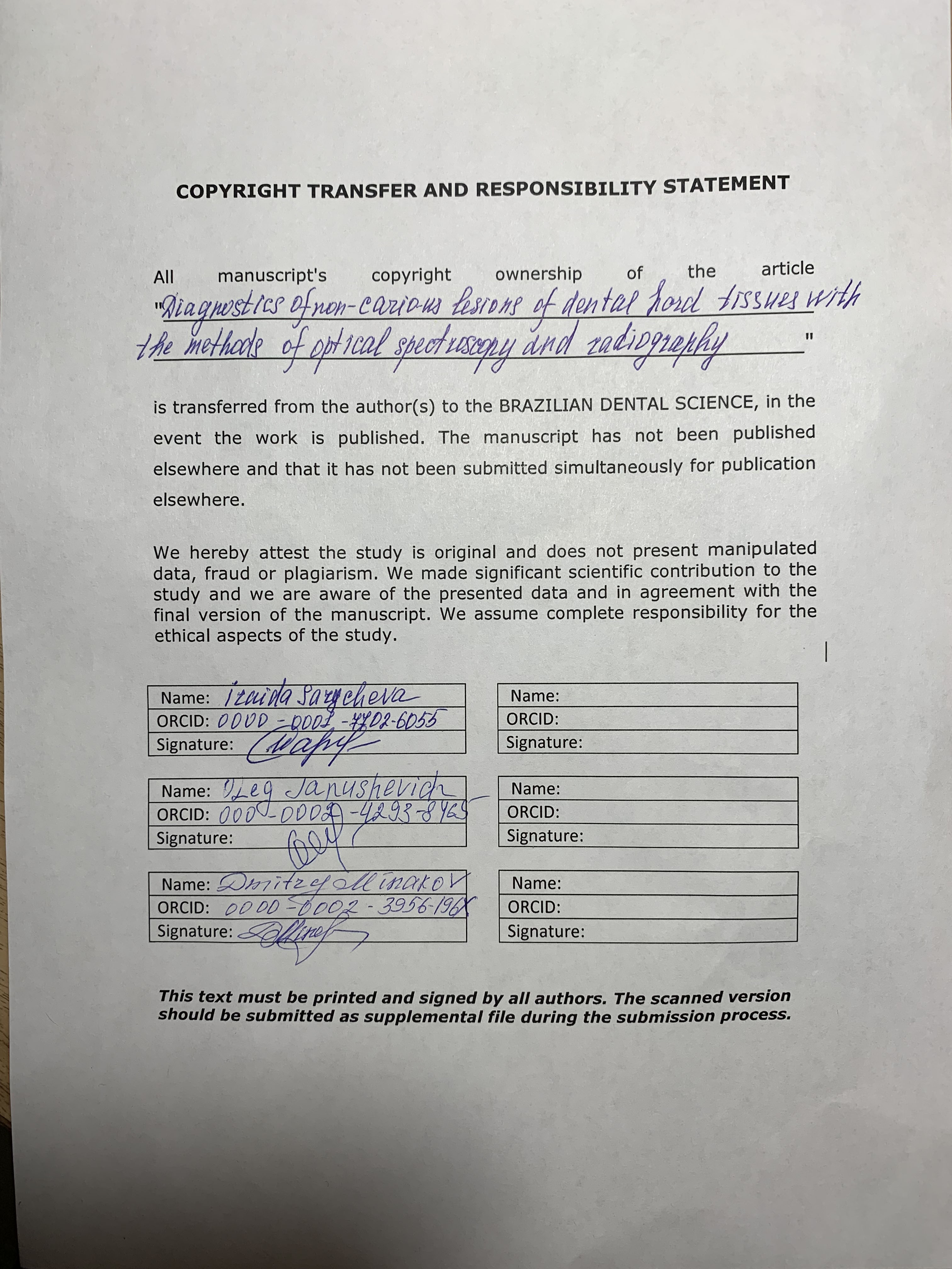 Brazilian Dental Science uses the Creative Commons (CC-BY 4.0) license, thus preserving the integrity of articles in an open access environment. The journal allows the author to retain publishing rights without restrictions.
