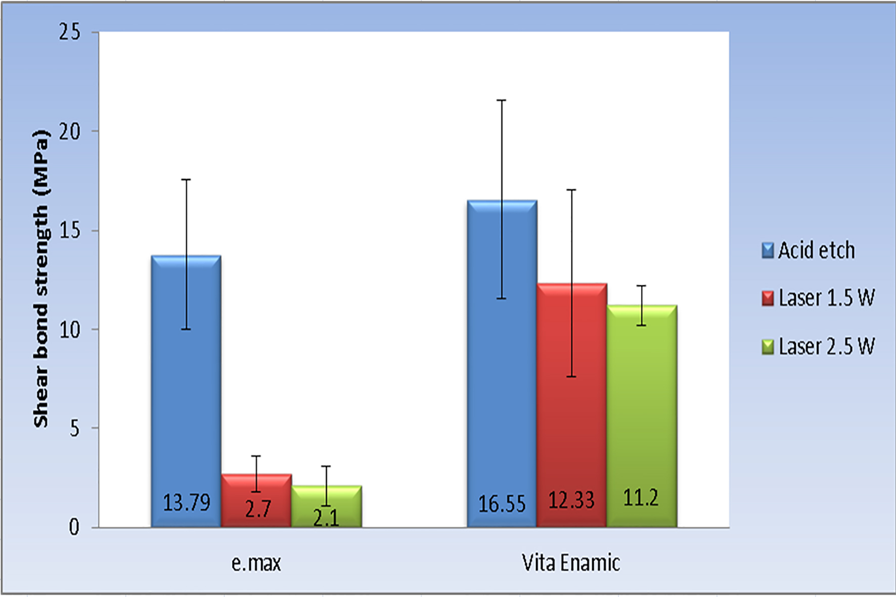 Kursoglu P, Motro PFK, Yurdaguven H. Shear bond strength of resincement to an acid etched and a laser irradiated ceramic surface. J AdvProsthodont 2013;5:98–103. doi:10.4047/jap.2013.5.2.98.