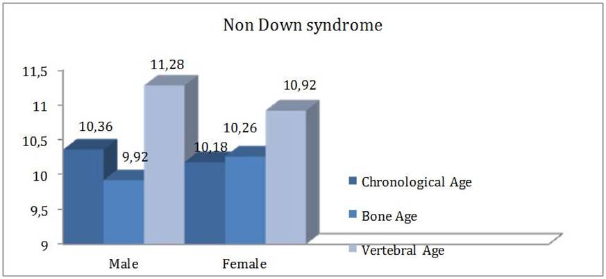This study evaluated the applicability of the method developed by Caldas to measure vertebral bone age for Brazilians suffering from Down syndrome. A database comprised of 57 case records of individuals with this syndrome, both male and female, with age ranging between 5 and 18 years, was assessed. These records had lateral cefalometric radiographies and radiographies of hand and wrist, being all obtained on the same date. Also, 48 records of individuals not suffering from Down syndrome were assessed. For the hand and wrist radiographies the Tanner and Whitehouse (TW3) method was used, and bone age was obtained. The Caldas method was employed on the lateral cefalometric radiographies in order to obtain the vertebral bone age. From the information about the bone age, vertebral bone age and chronological age, the Wilcoxon test was used to compare all the ages in pairs. There was a statistically significant difference between the three ages mentioned above for both male and female control group and female Down syndrome group. Therefore, this method was only suitable for  Down syndrome male individuals. Based on the results, a formula to obtain the bone age for Down syndrome individuals was developed.