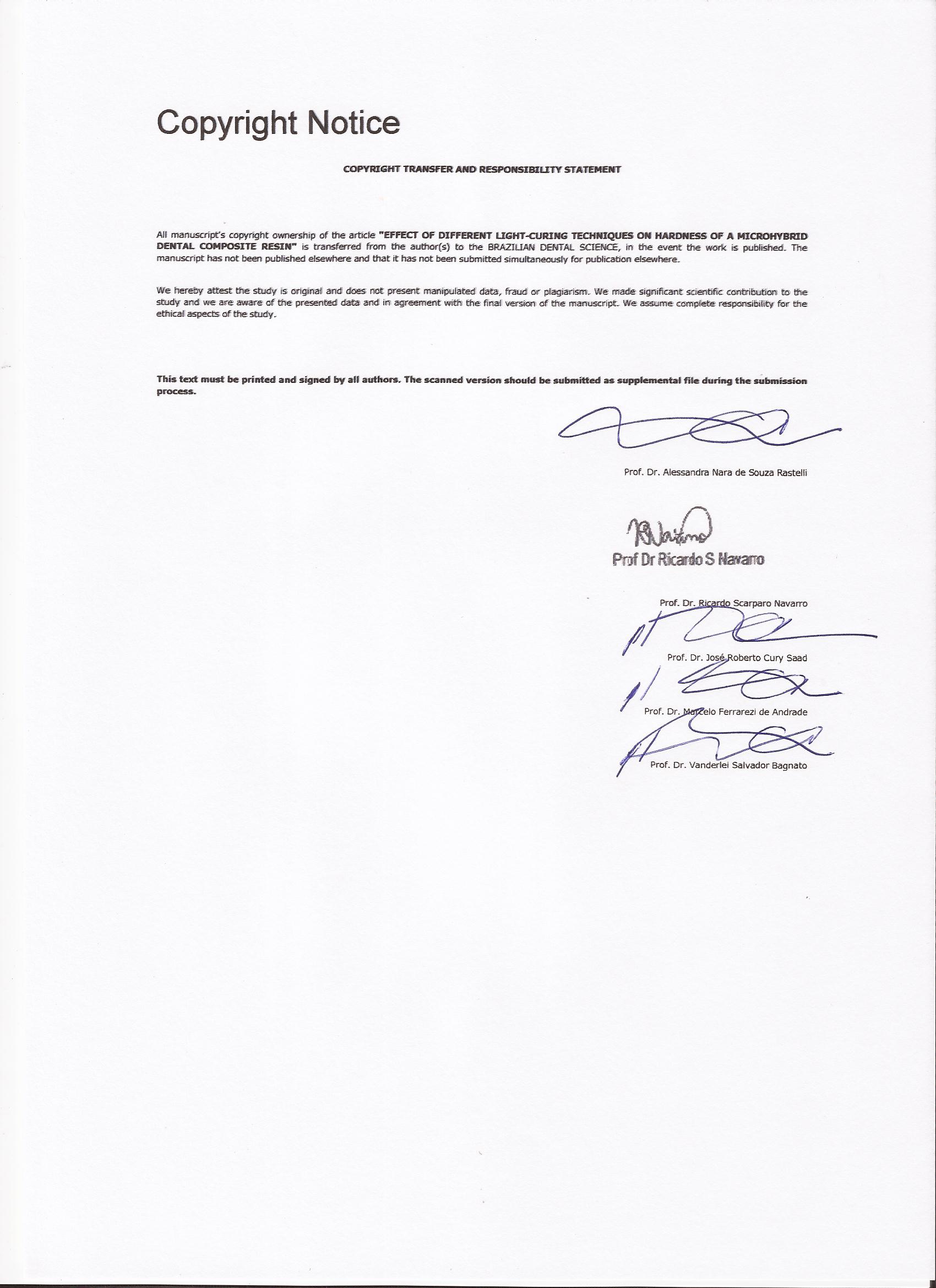 Brazilian Dental Science uses the Creative Commons (CC-BY 4.0) license, thus preserving the integrity of articles in an open access environment. The journal allows the author to retain publishing rights without restrictions.